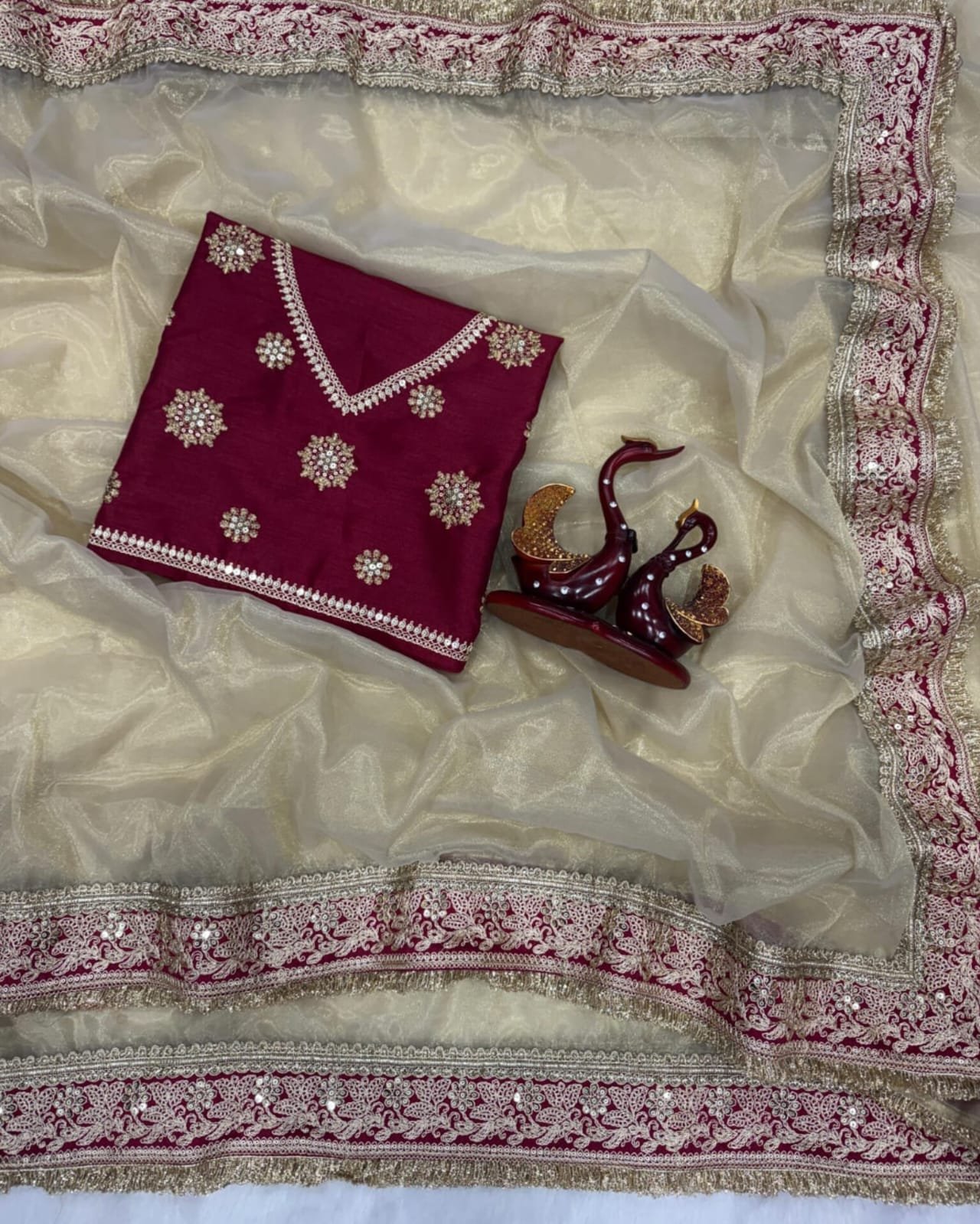 The sparkling beauty of this contemporary saree lies in its intricate handcrafted embellishments, giving it a radiant and glamorous appeal.