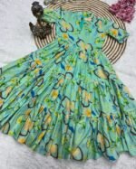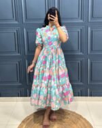 Crafted from soft muslin cotton, this maxi features beautiful print work and a trendy 3-layer pattern, giving it a flowy and elegant look.