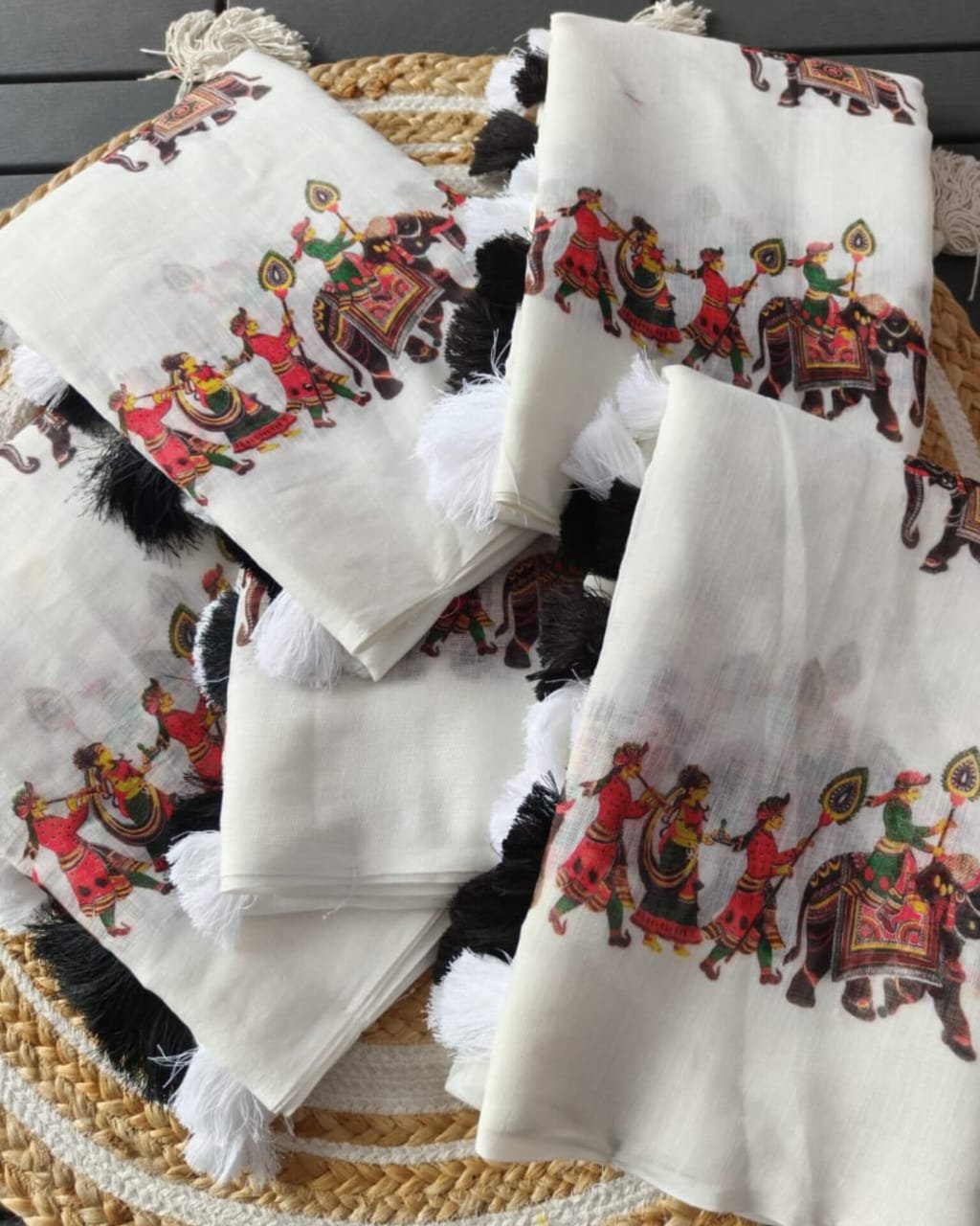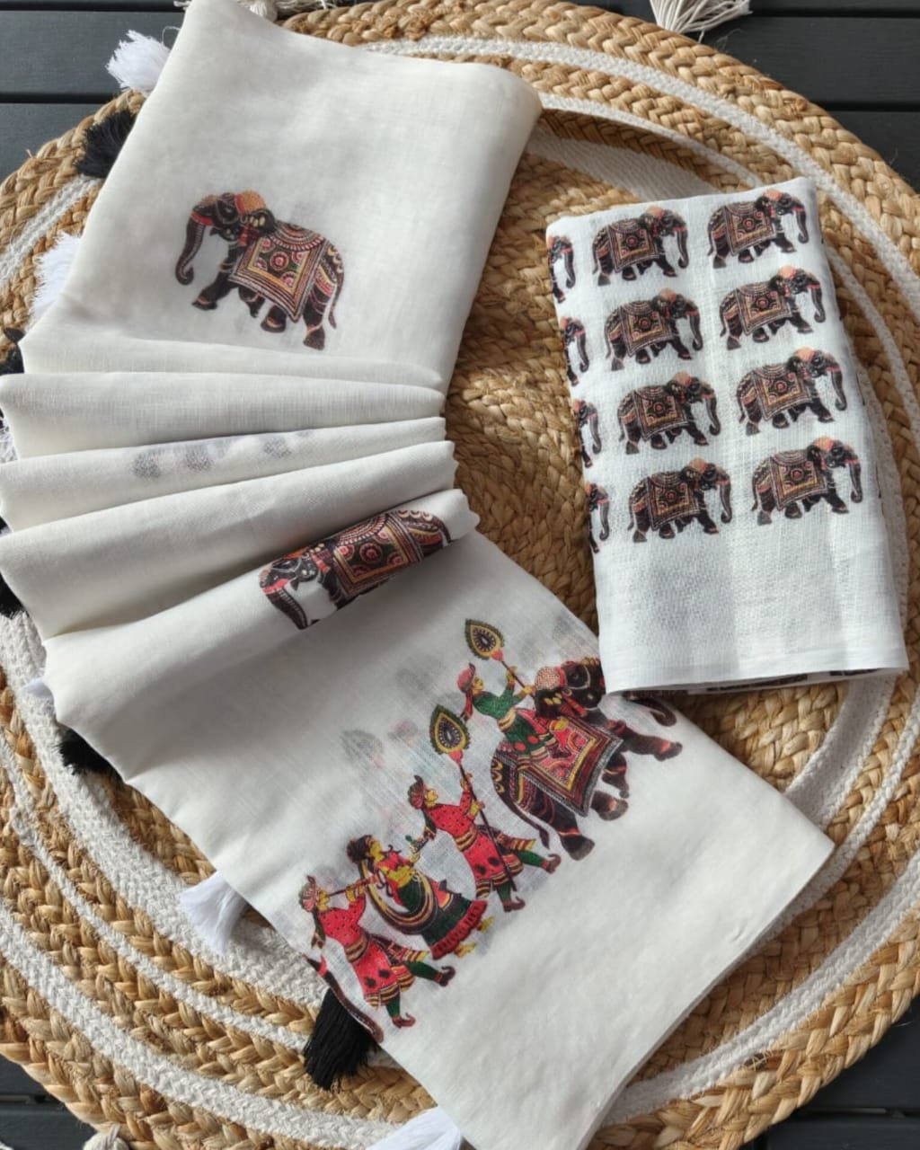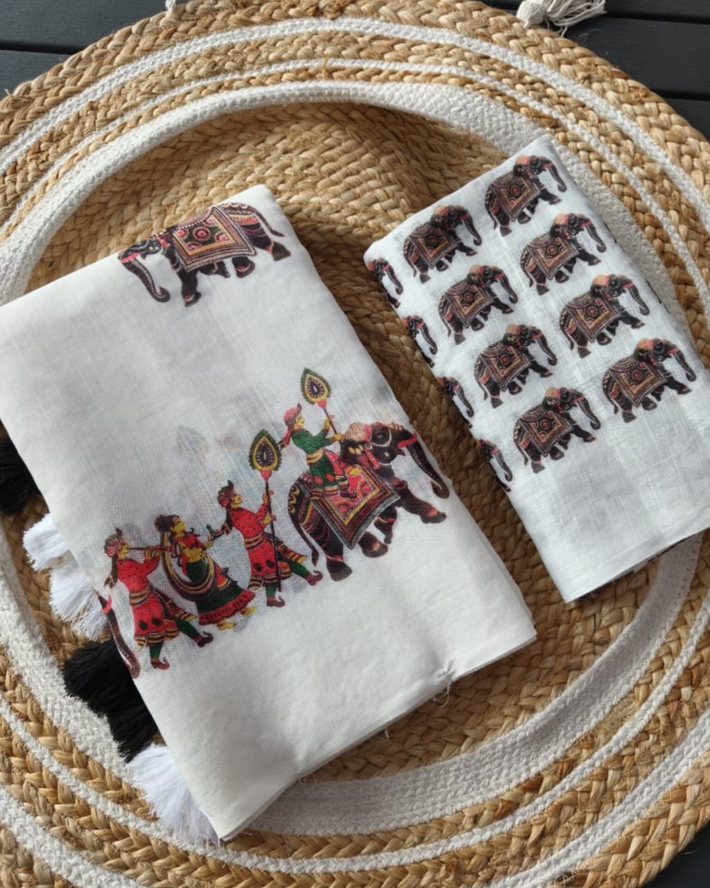 Step into timeless grace with our Royal Hathi saree — where tradition meets refined artistry. Crafted from heavy linen blooming fabric, this saree features a luxurious drape and exceptional comfort, perfect for festive and special occasions.