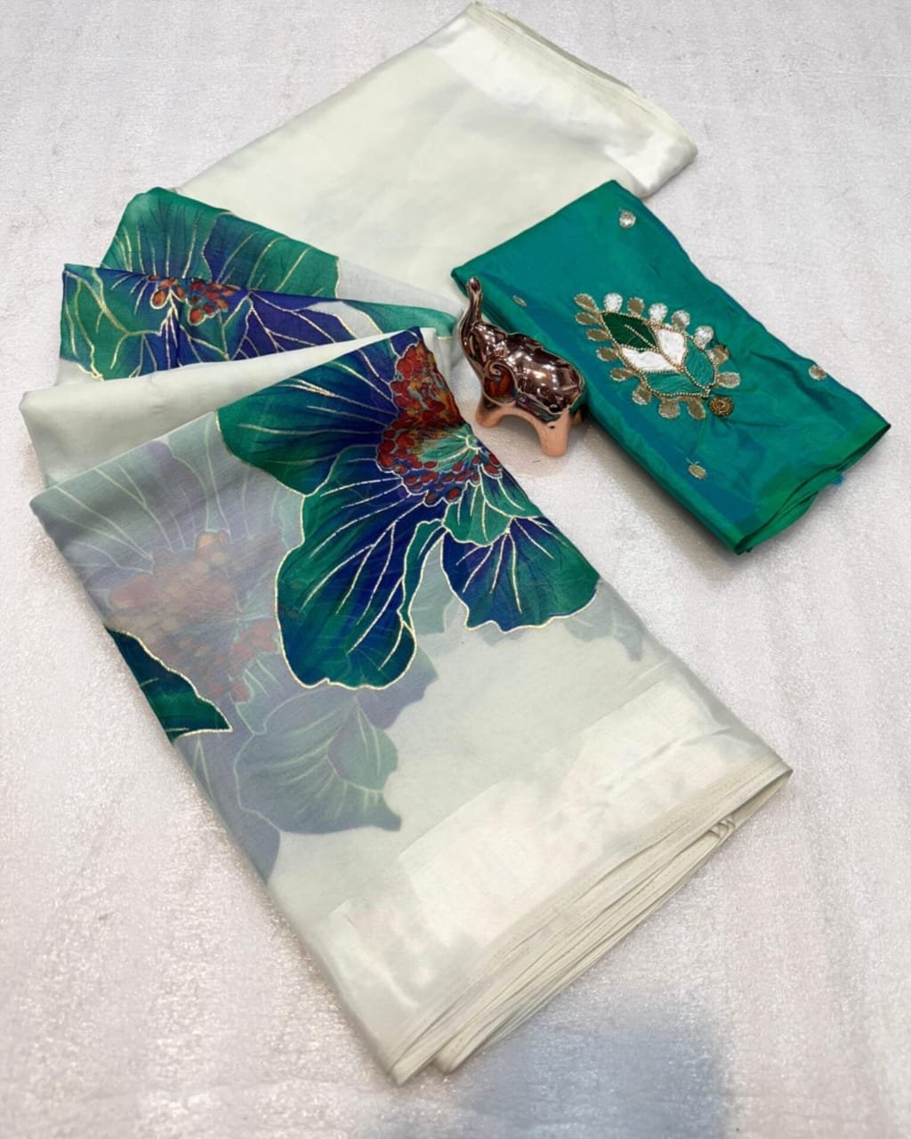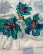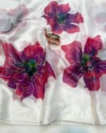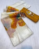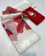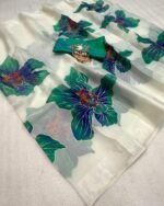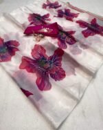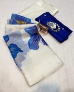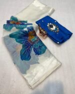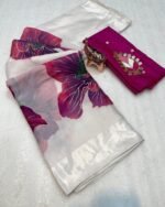 Introducing the Paradise Petal Saree from the Kinnara Catalogue, a stunning new arrival crafted in premium Pure Soft Organza. The saree features beautiful large floral prints highlighted with a foil outline, giving it a rich and graceful appeal. Paired with a designer butti work blouse piece, this saree brings together elegance and freshness in every drape.