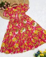 Radiate vibrant charm with the Rose Ember Maxi, a perfect blend of rich colors, soft cotton comfort, and timeless floral elegance. The fiery mix of pink, yellow, and white blooms makes it a statement piece — ideal for brunches, picnics, or festive outings.