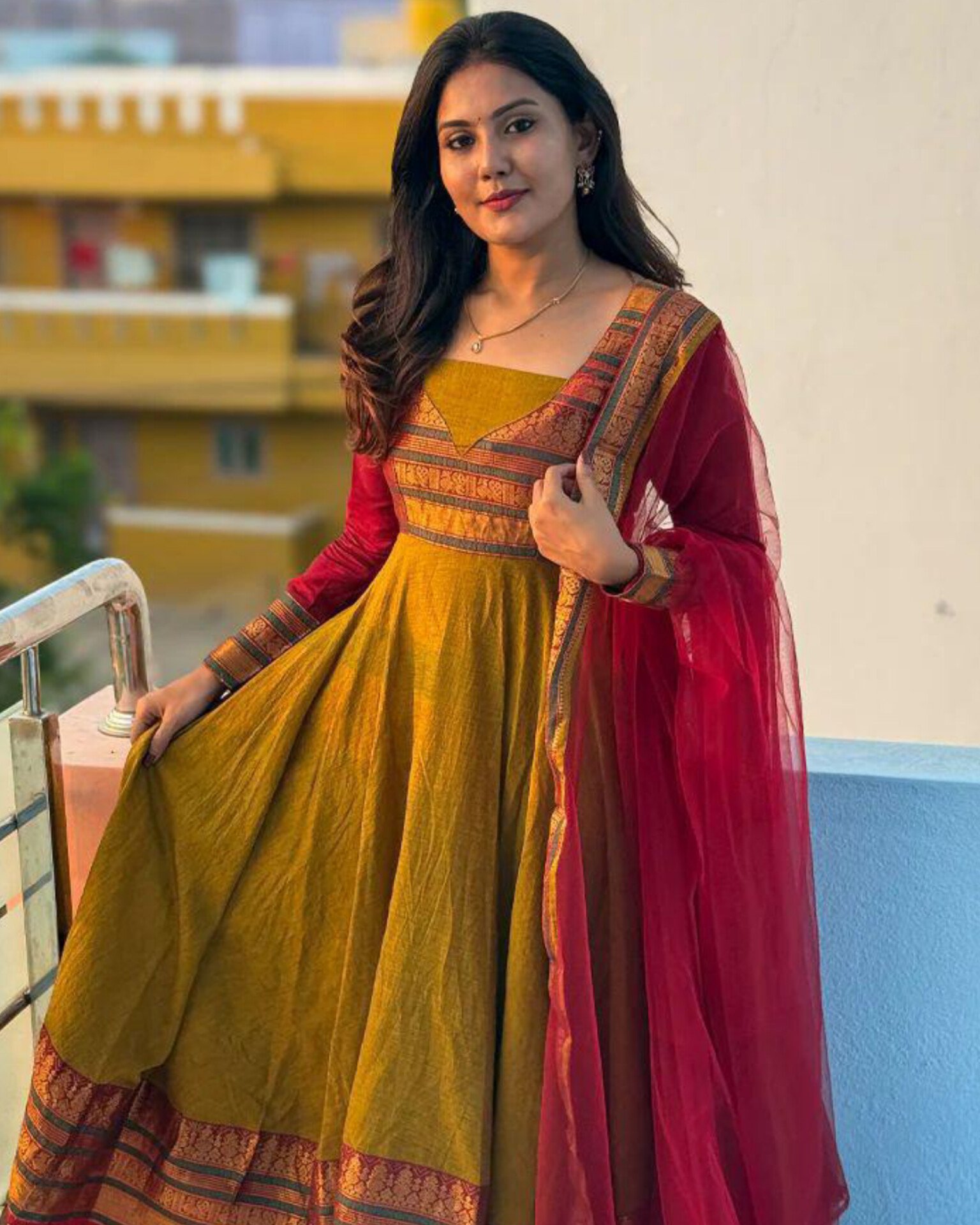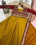 A timeless blend of elegance and tradition, the Marigold Royal Anarkali is crafted to give you a rich ethnic look with premium comfort. Designed in Vichitra Silk with a beautifully woven Jacquard Zari Border, this outfit brings effortless grace to any festive or special occasion. The set is paired with a soft Net Dupatta featuring an elegant lace border for a complete royal finish.