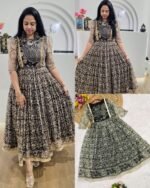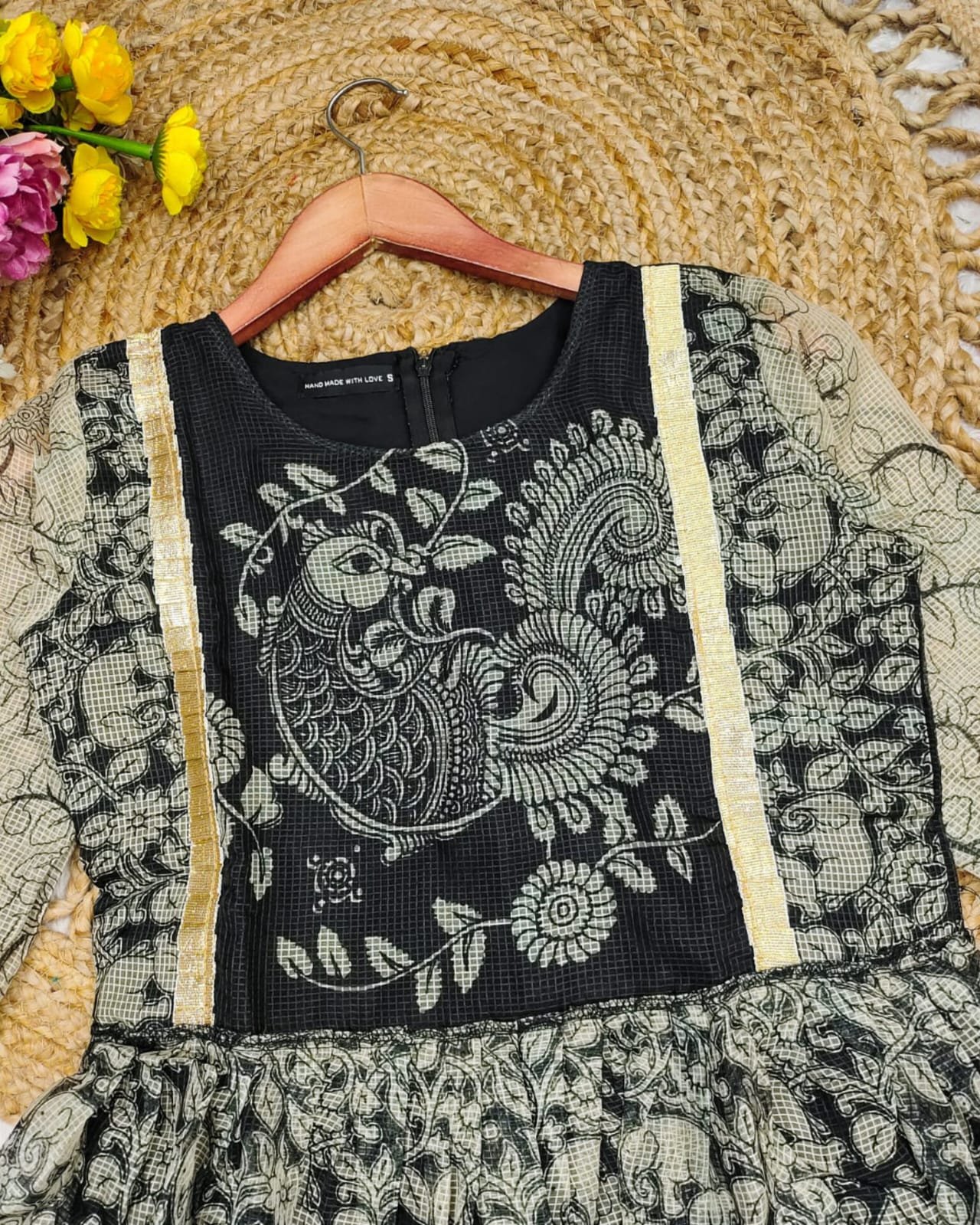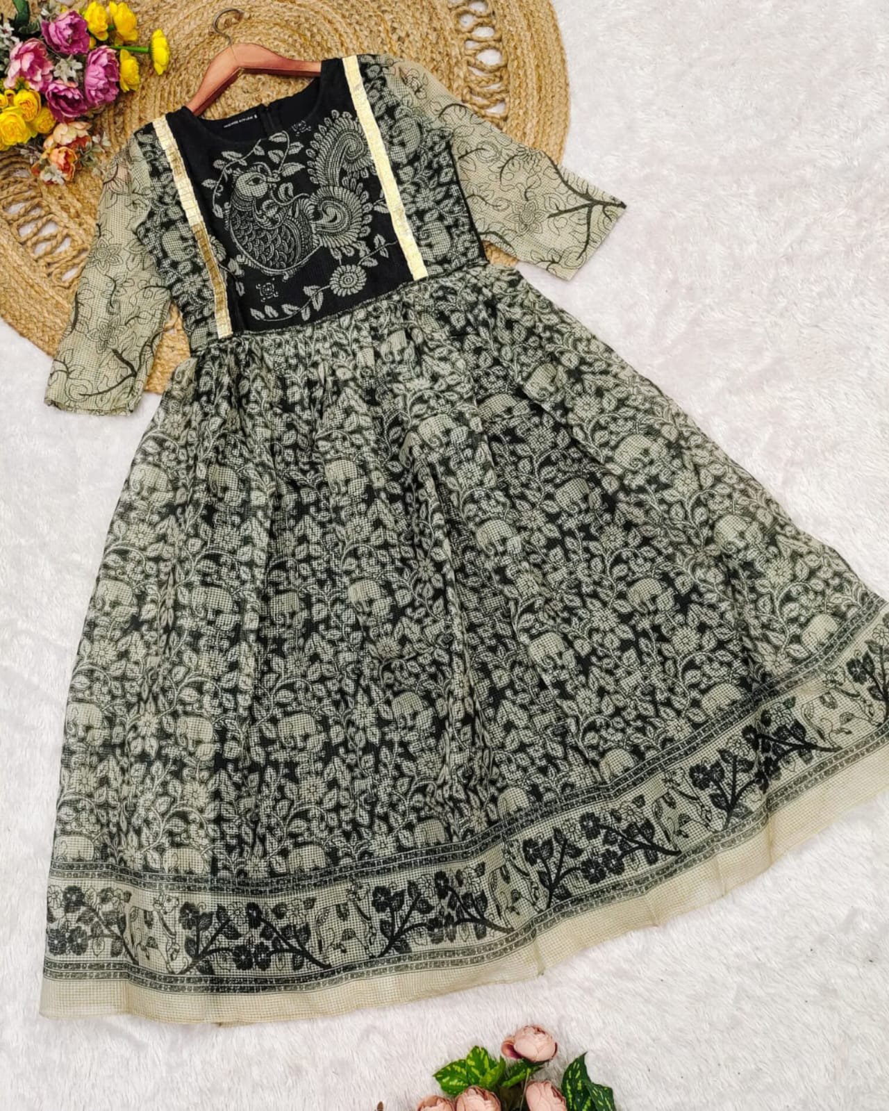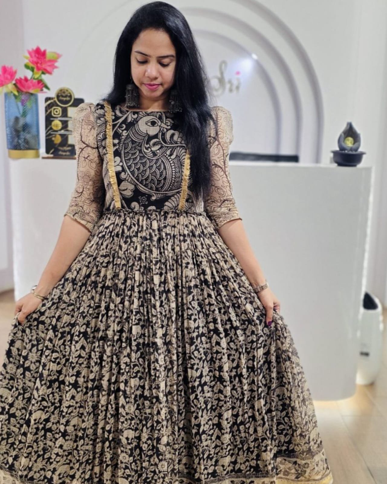 Step into timeless sophistication with our Noir Elegance Maxi, a masterpiece inspired by traditional Kalamkari artistry. Crafted from lightweight cubic fabric, this beauty blends classic charm with modern grace. The intricate print, flattering silhouette, and graceful sleeves create a look that’s both regal and effortlessly wearable. Perfect for festive gatherings or elegant evenings, it’s a statement of refined style. ✨