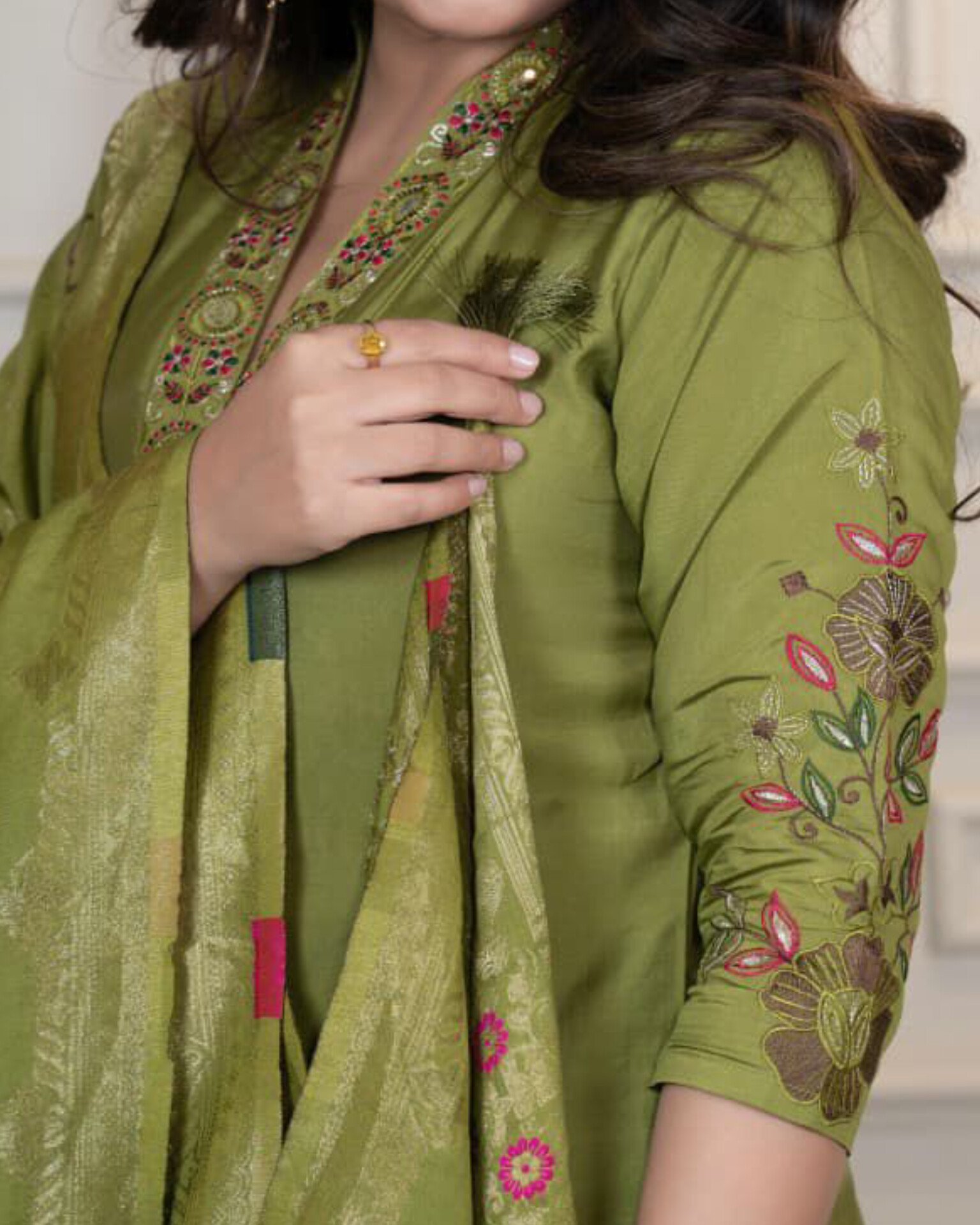 • Dupatta: Heavy Nylon Muslin Jacquard with Latkan – 2.30 meters