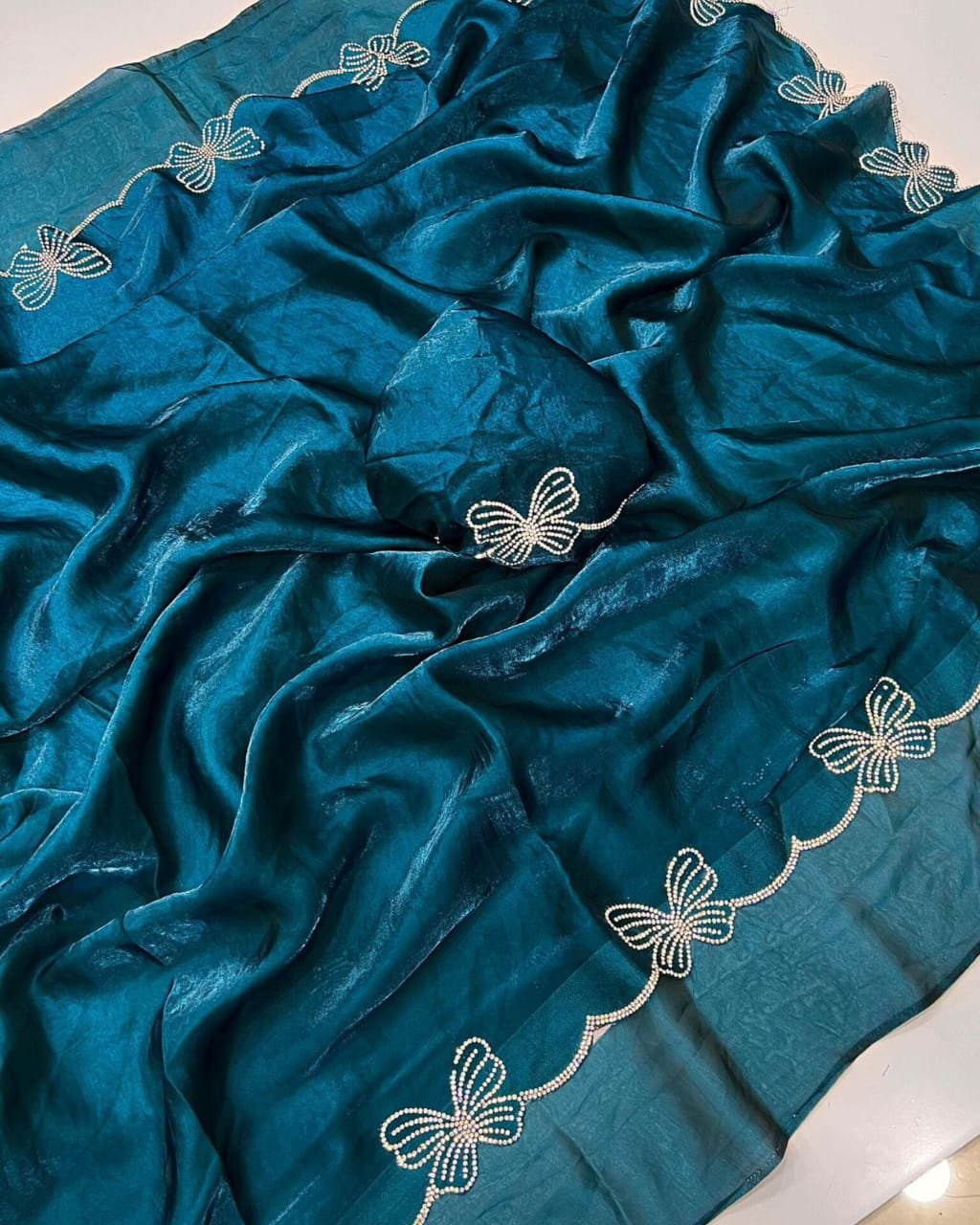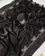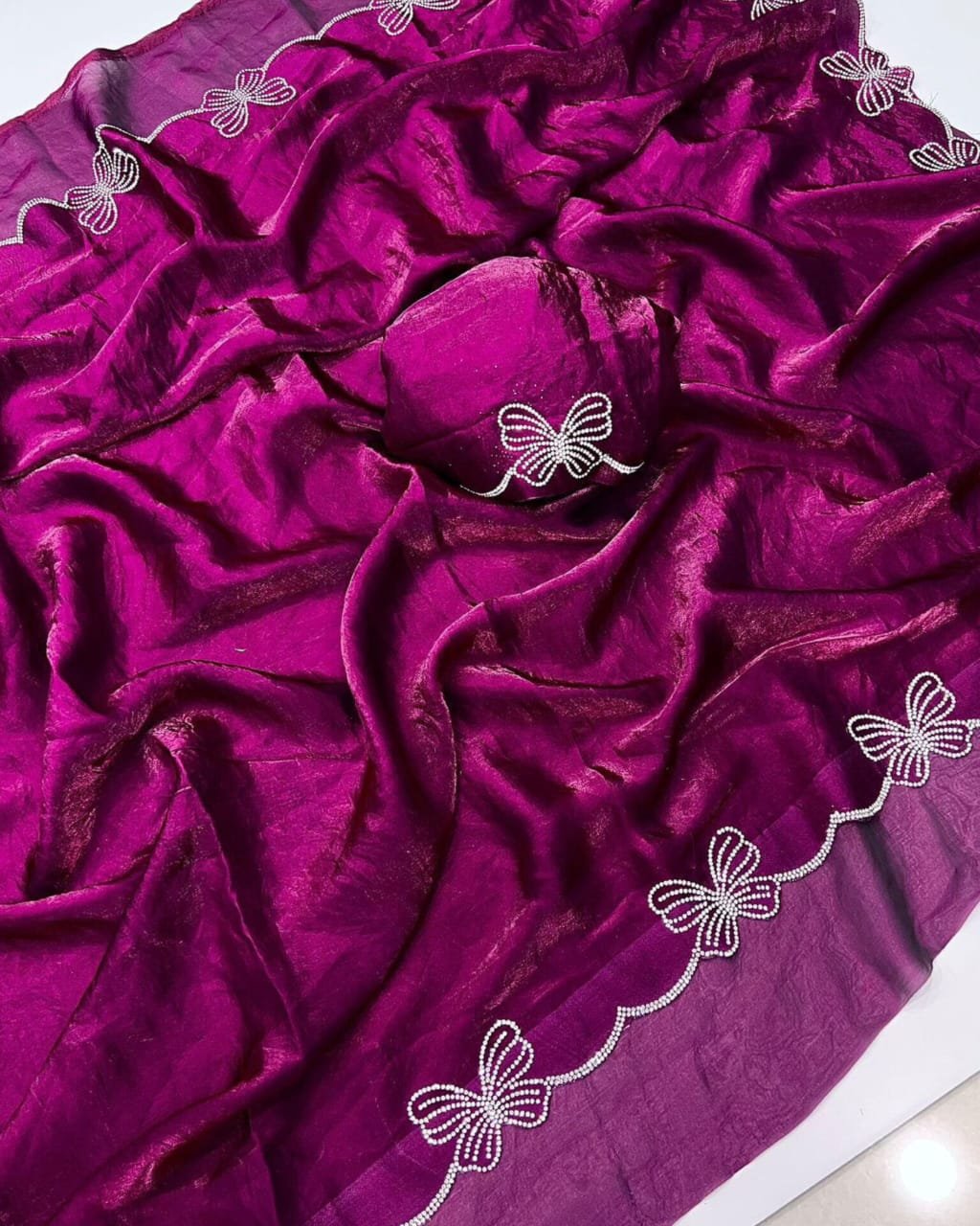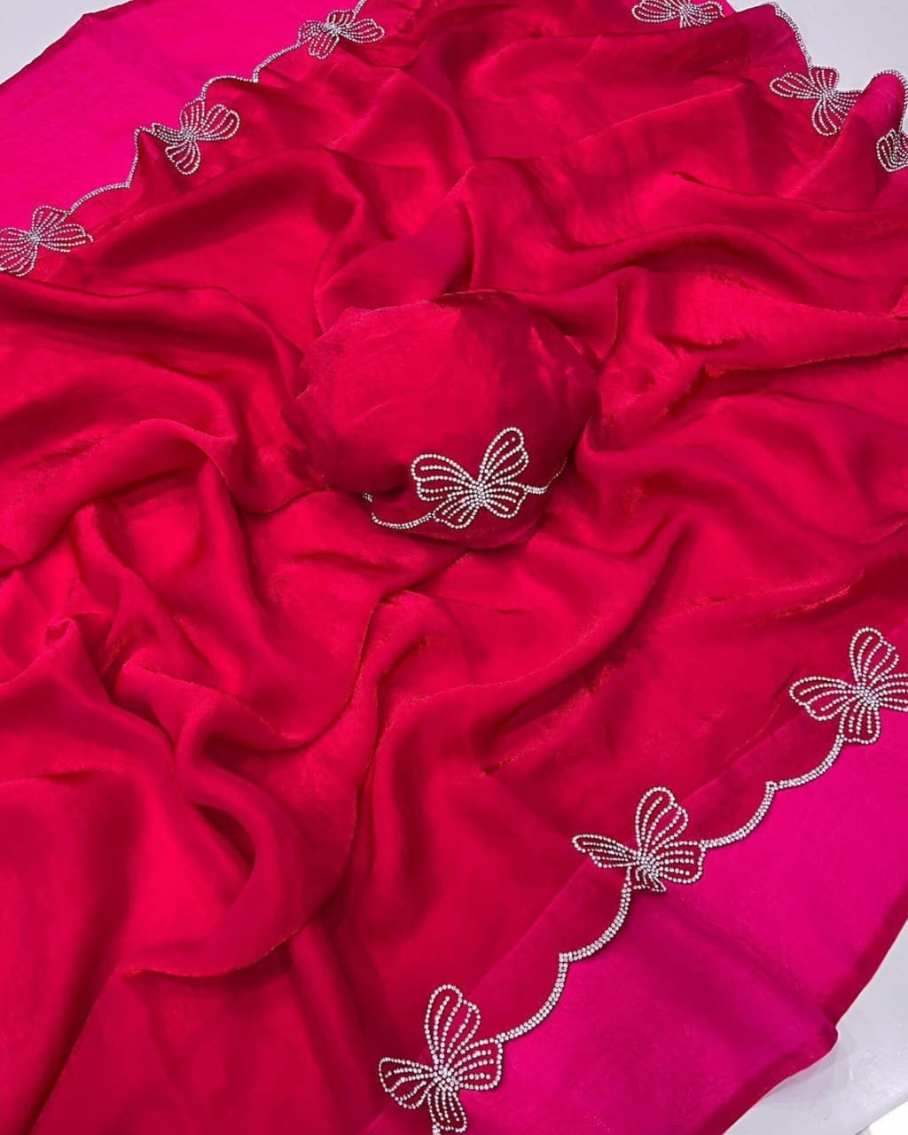 Presenting the stunning Butterfly Bliss Saree, beautifully crafted on rich space silk fabric known for its soft, shiny, and luxurious drape. The saree features an elegant Butterfly Diamond Panel Work Border, adorned with premium gold and silver diamond accents and signature butterfly-cut detailing, adding a graceful charm to every pleat and pallu.