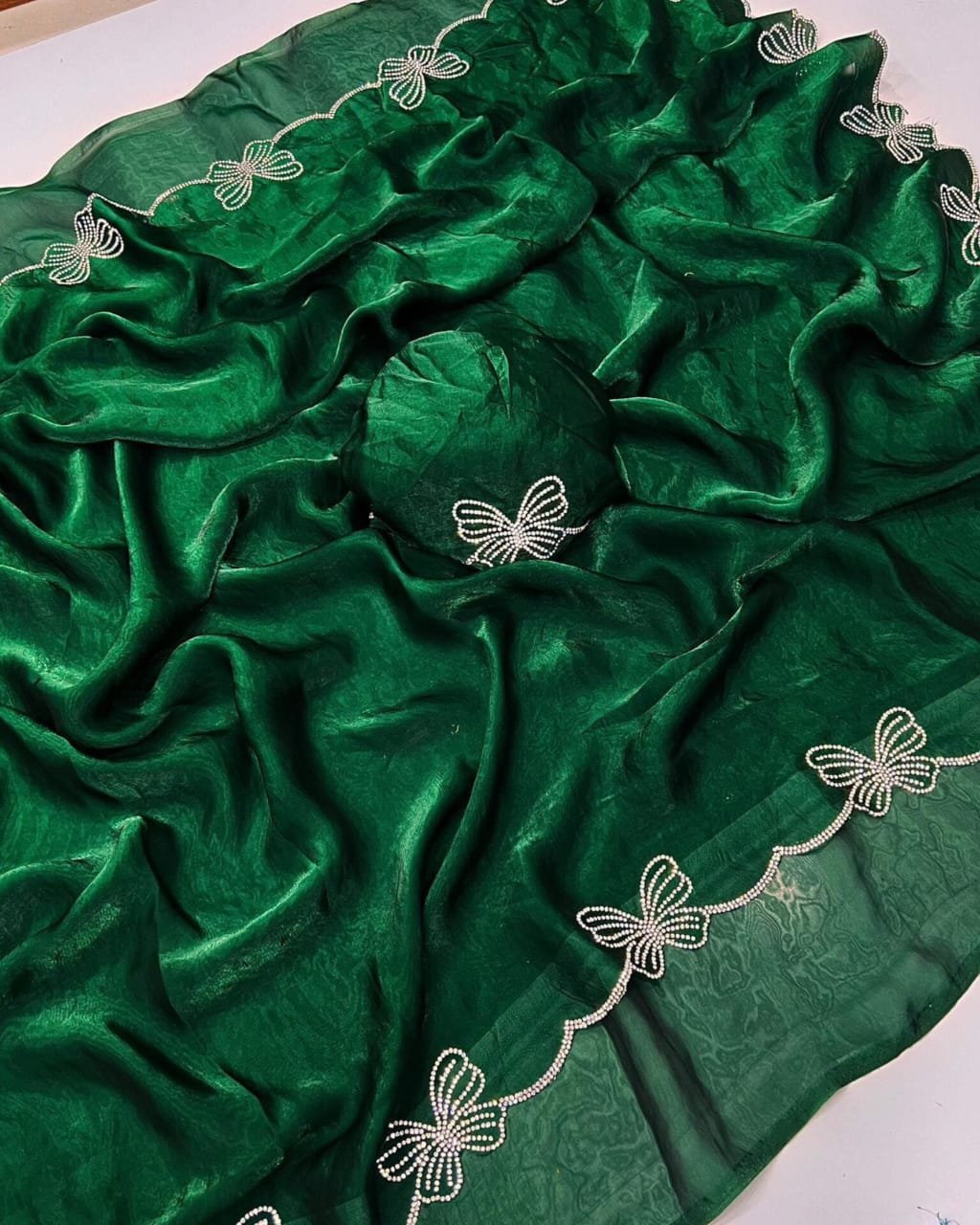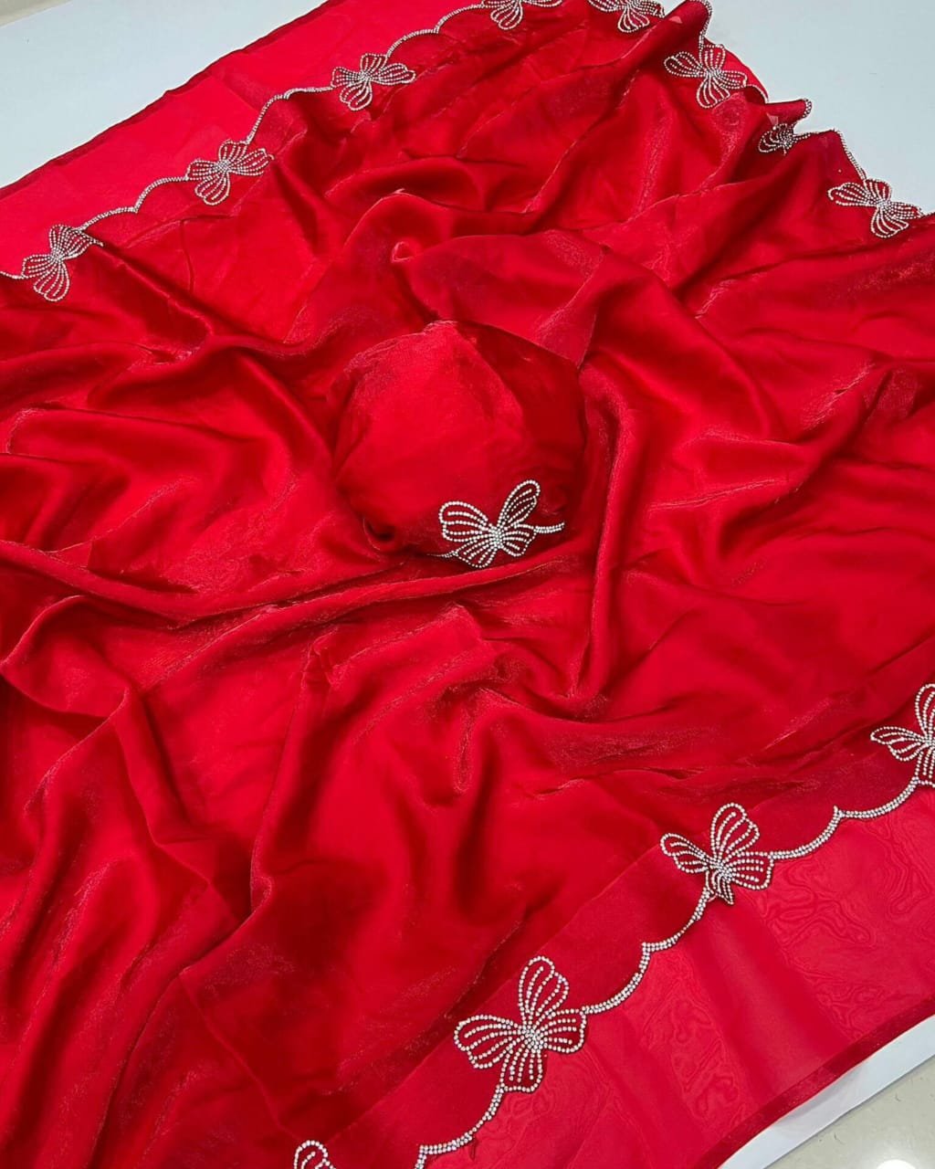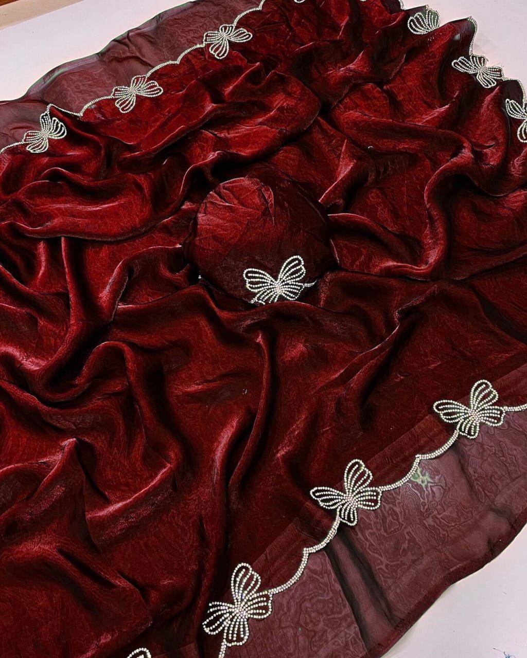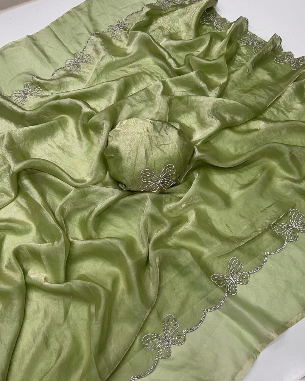 Presenting the stunning Butterfly Bliss Saree, beautifully crafted on rich space silk fabric known for its soft, shiny, and luxurious drape. The saree features an elegant Butterfly Diamond Panel Work Border, adorned with premium gold and silver diamond accents and signature butterfly-cut detailing, adding a graceful charm to every pleat and pallu.