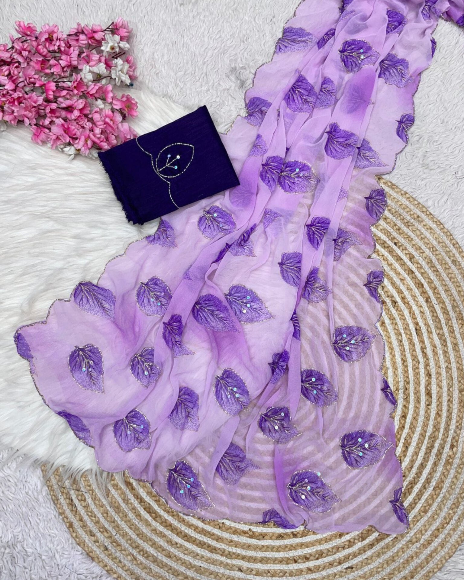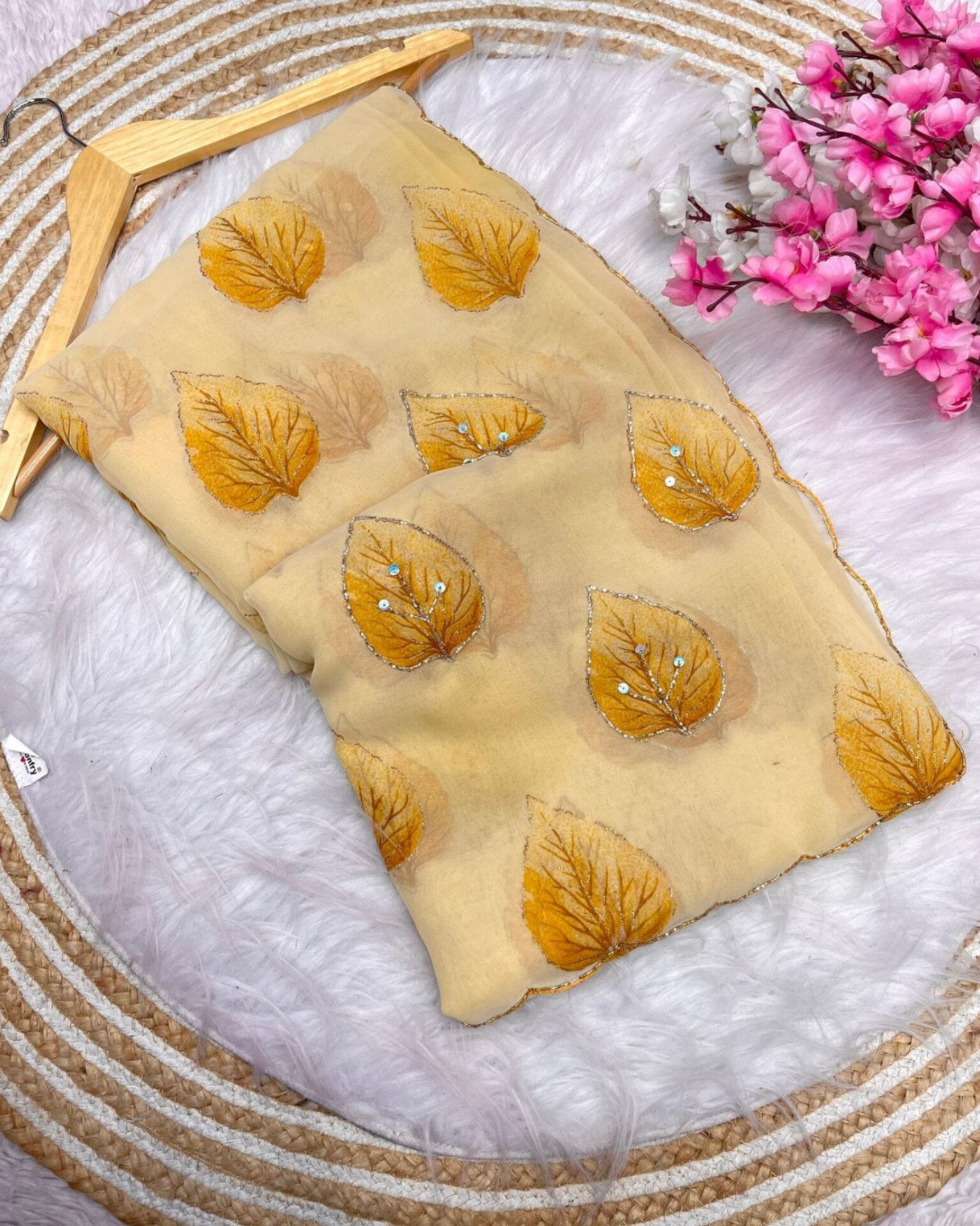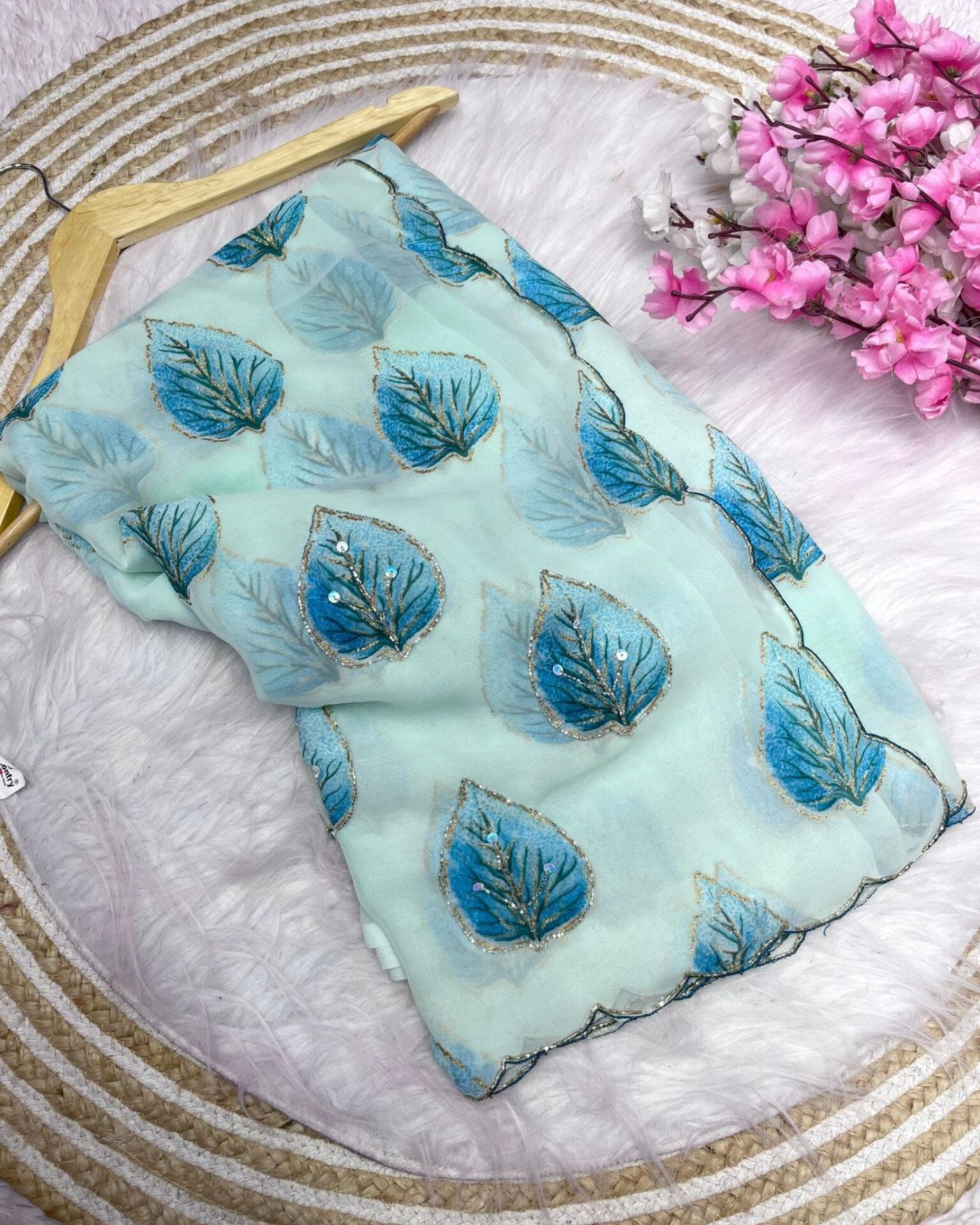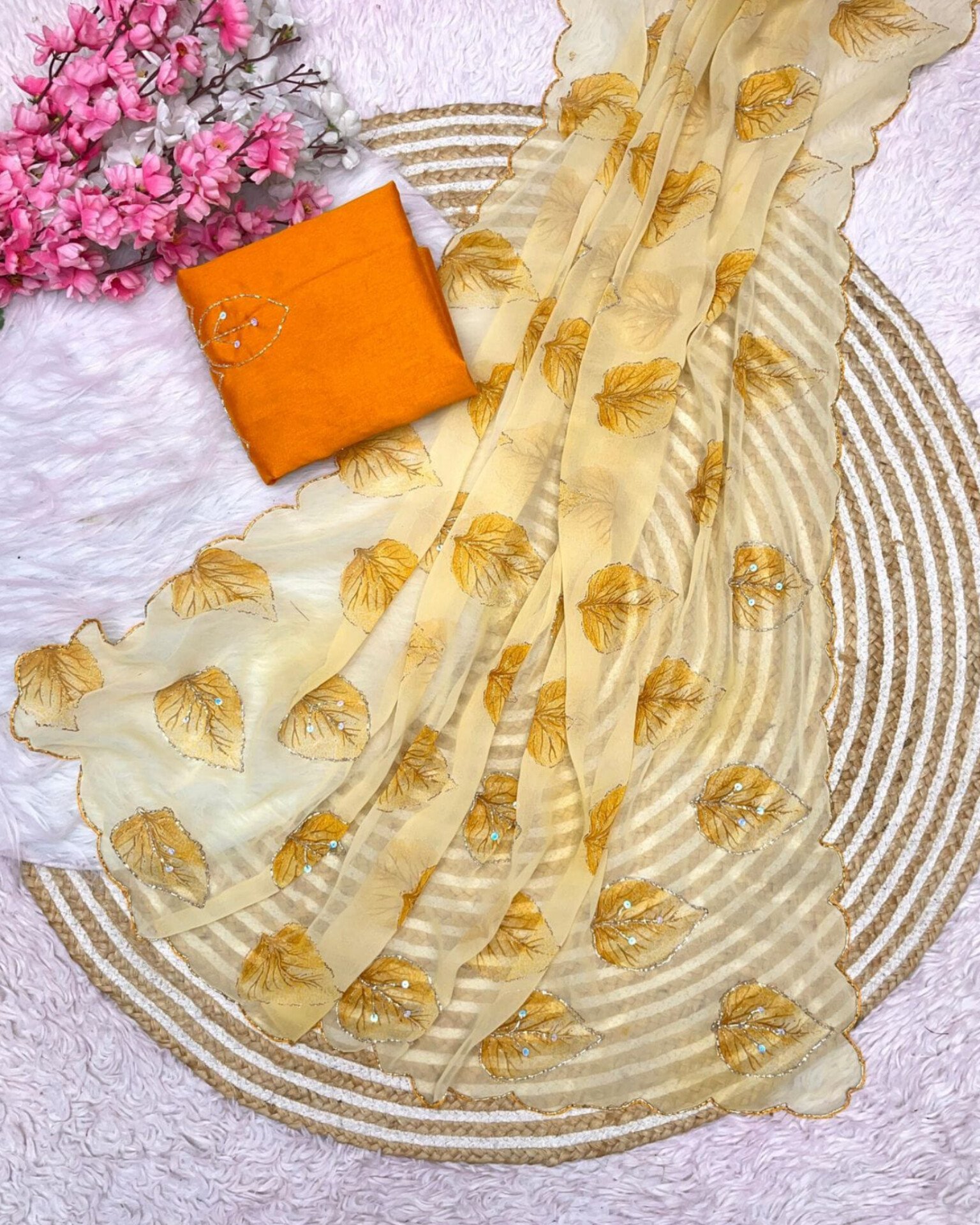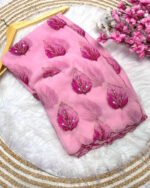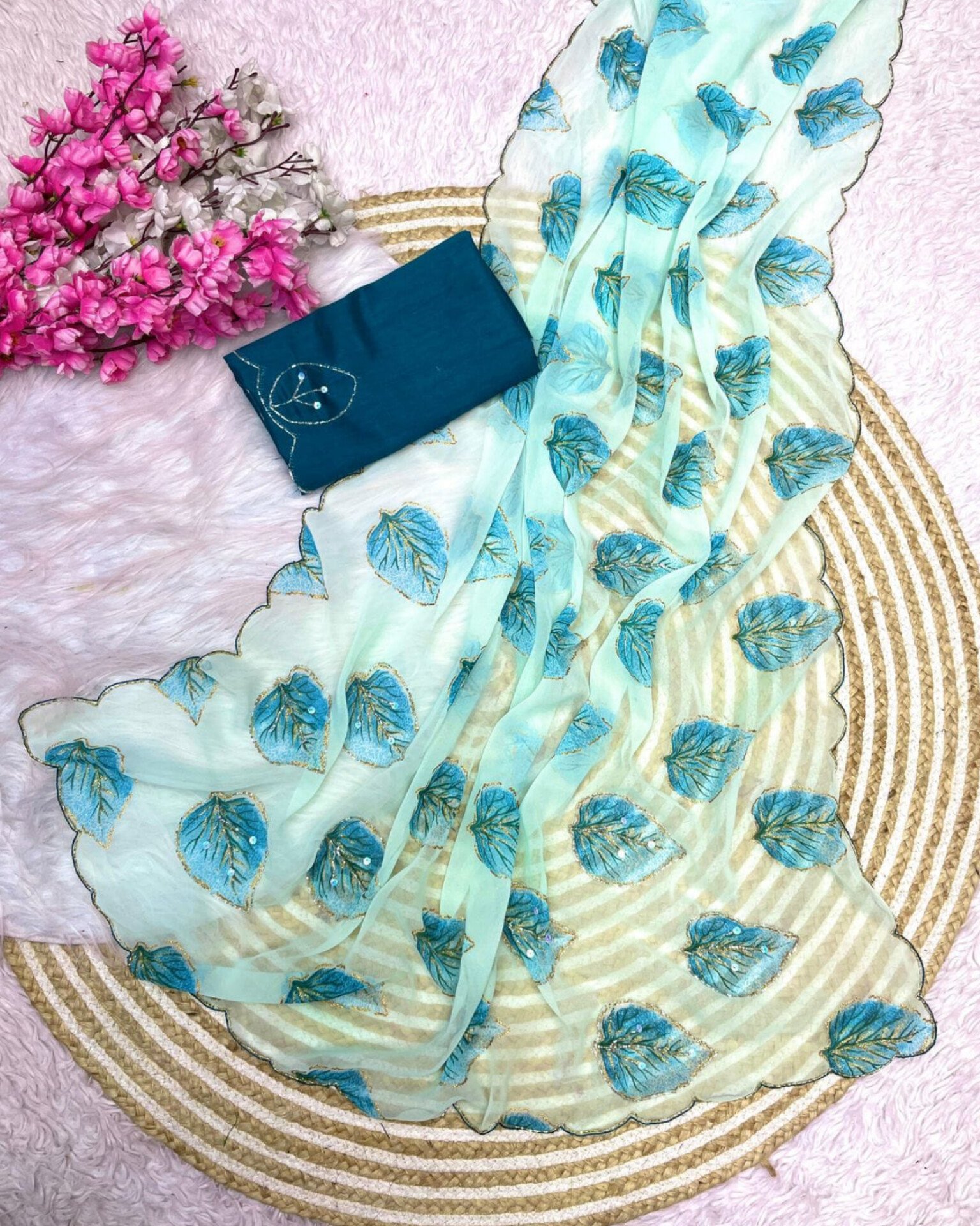 It comes with an unstitched mono banglori blouse featuring stunning khatli cut dana handwork, giving a premium designer finish. Perfect for parties, weddings, festive events, or photoshoots—this saree ensures you stand out wherever you go.