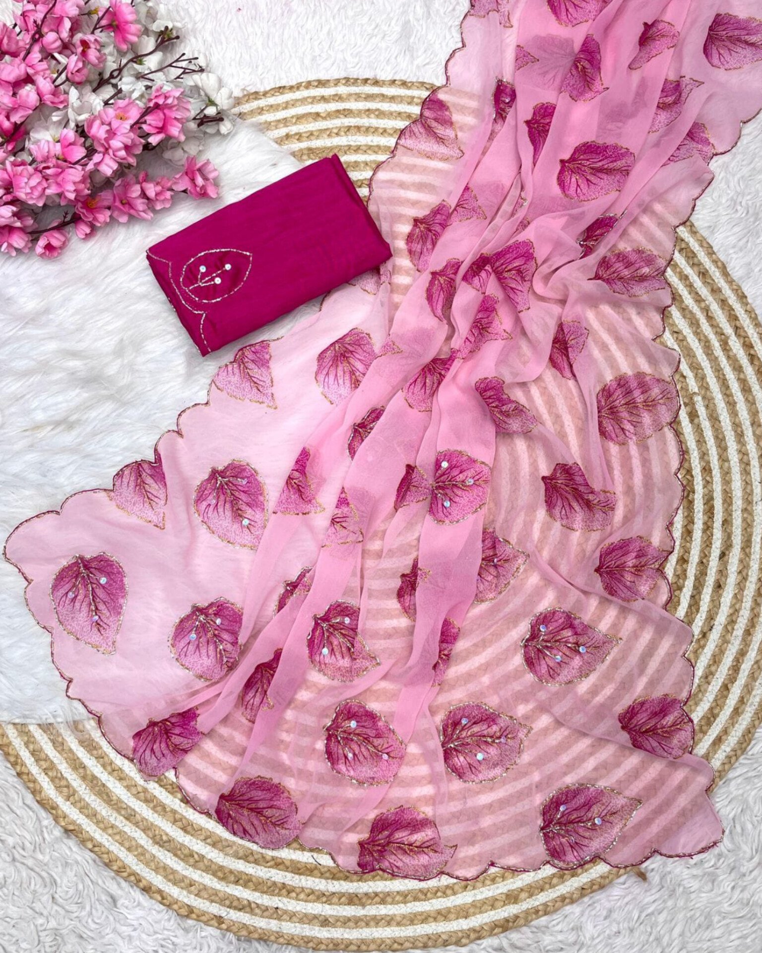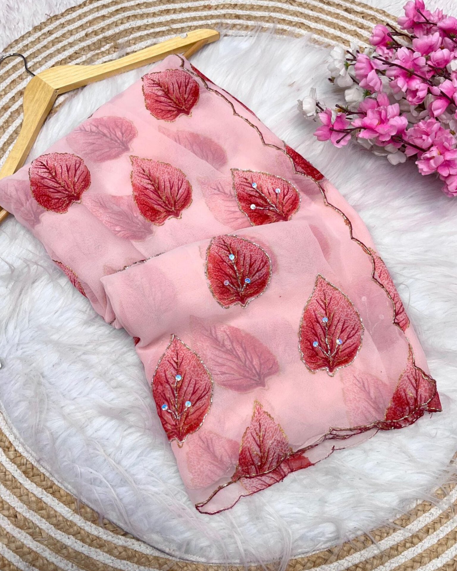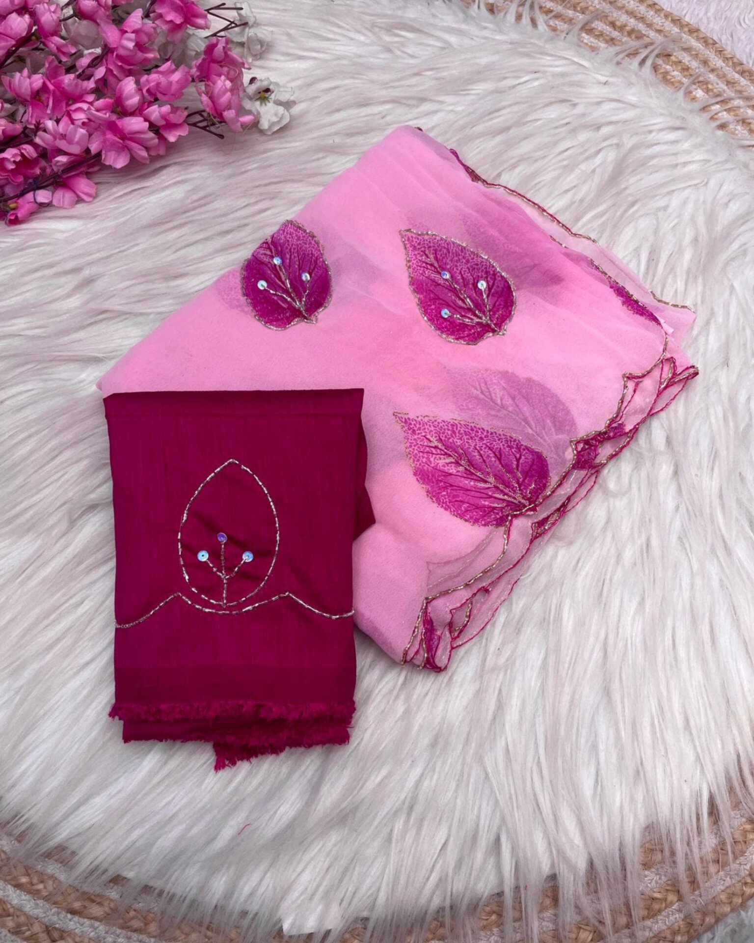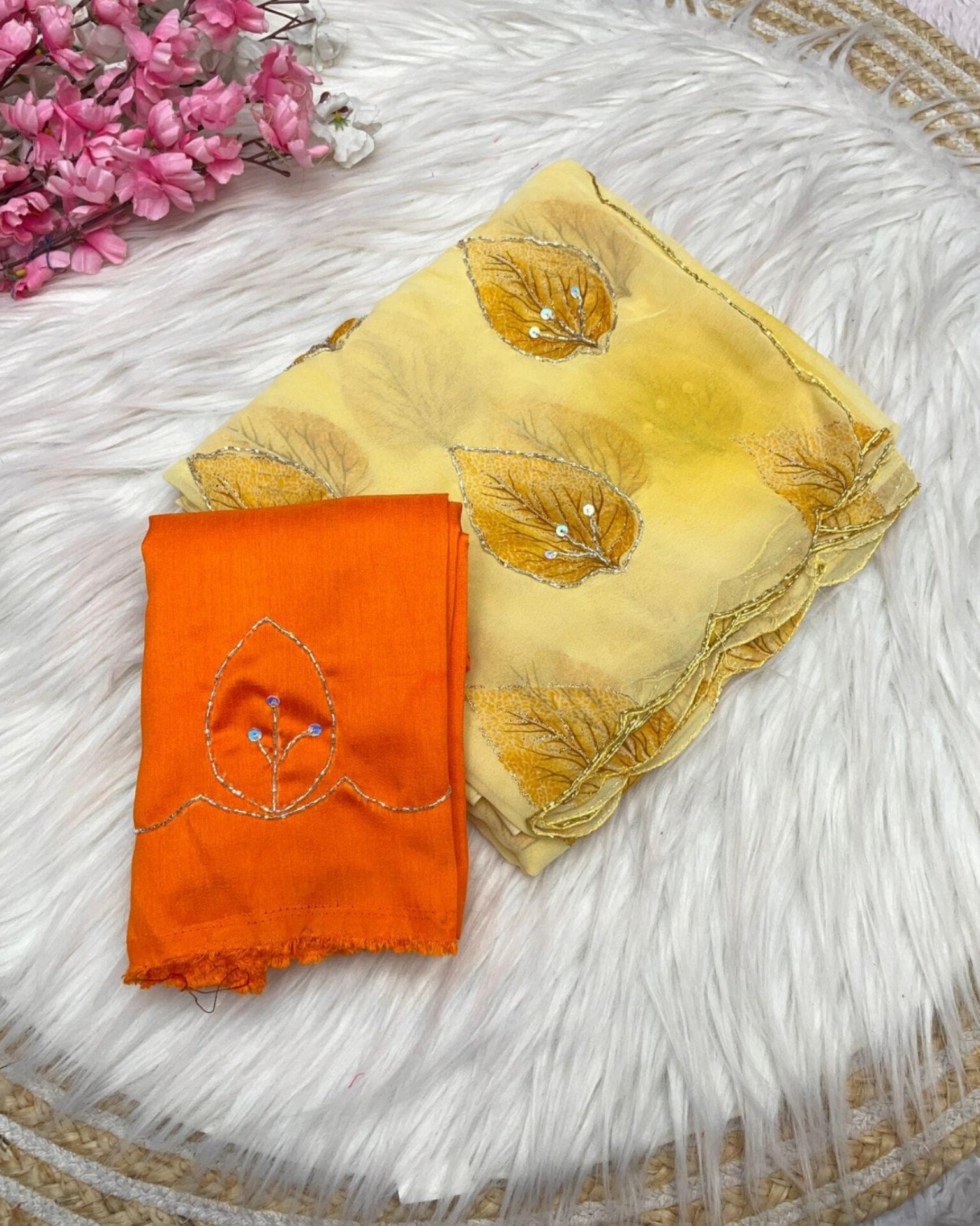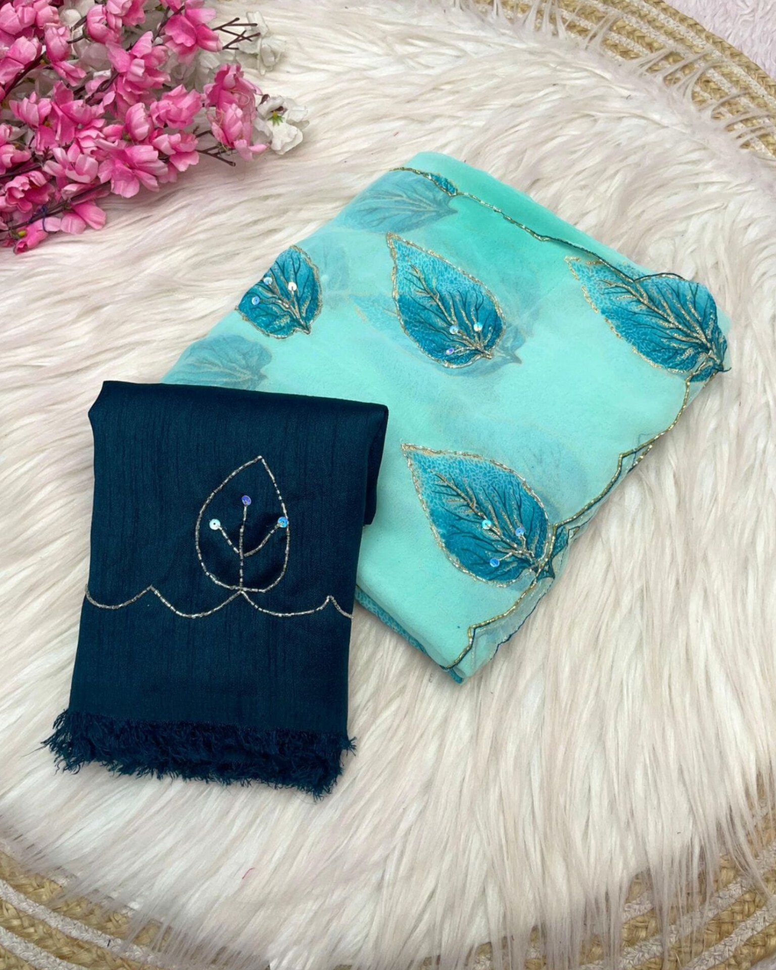 It comes with an unstitched mono banglori blouse featuring stunning khatli cut dana handwork, giving a premium designer finish. Perfect for parties, weddings, festive events, or photoshoots—this saree ensures you stand out wherever you go.
