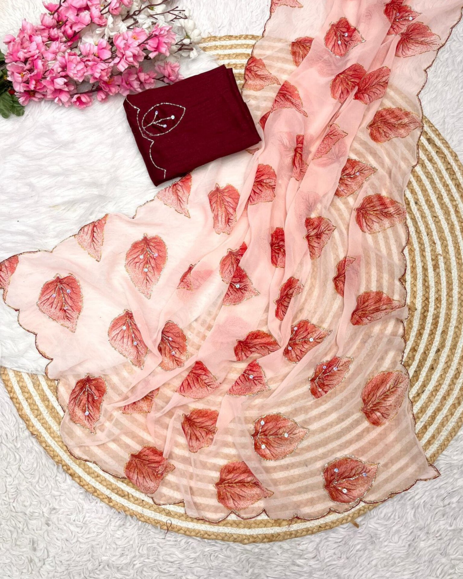 Introducing the Leaf Touch Saree, a New Bollywood Trending Design made to give you a flawless celebrity look. Crafted from premium wetless jari print fabric, this saree offers a beautiful flow, rich shine, and lightweight comfort. The elegant leaf motifs paired with the all-over arco border add a touch of charm and sophistication.