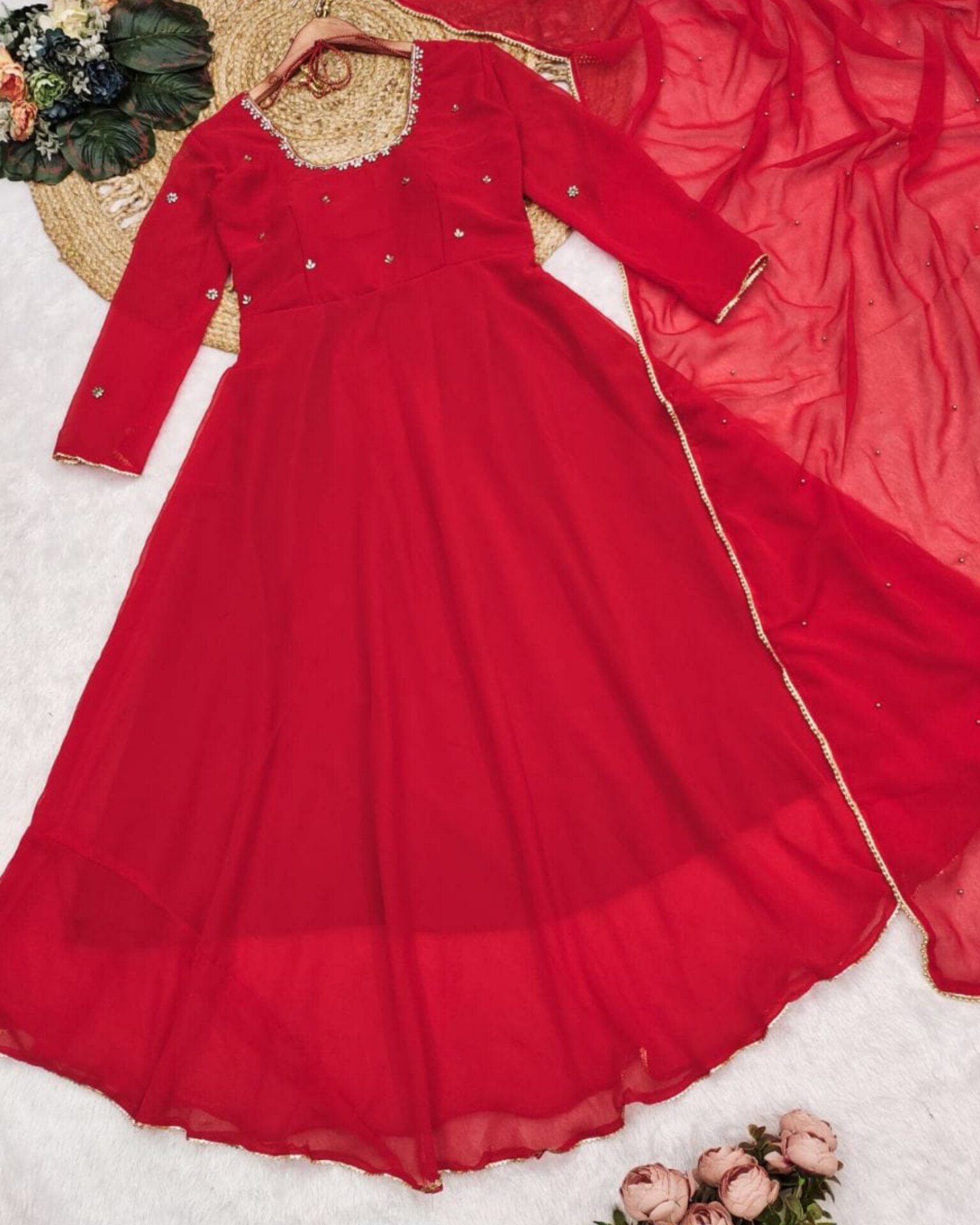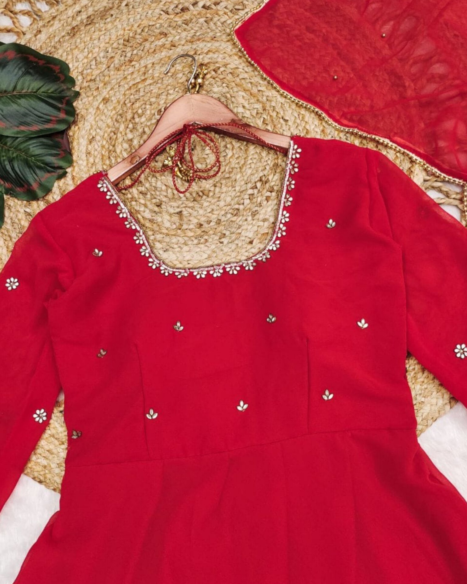 Make a graceful statement with the Red Roshanara Gown, a stunning georgette Anarkali set designed to bring timeless elegance and festive charm to your wardrobe. Adorned with delicate handwork and a flowing silhouette, this outfit is perfect for weddings, parties, and celebratory occasions.