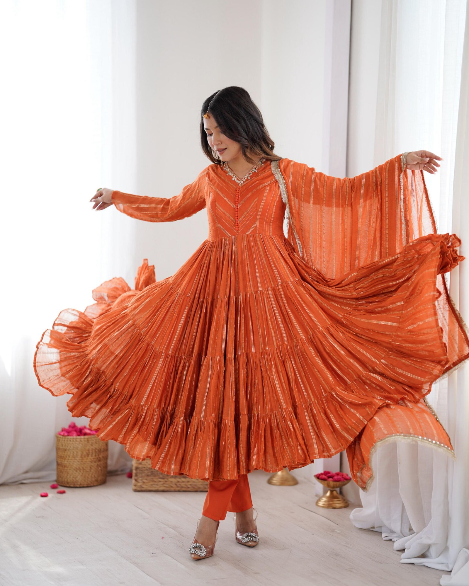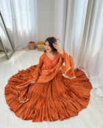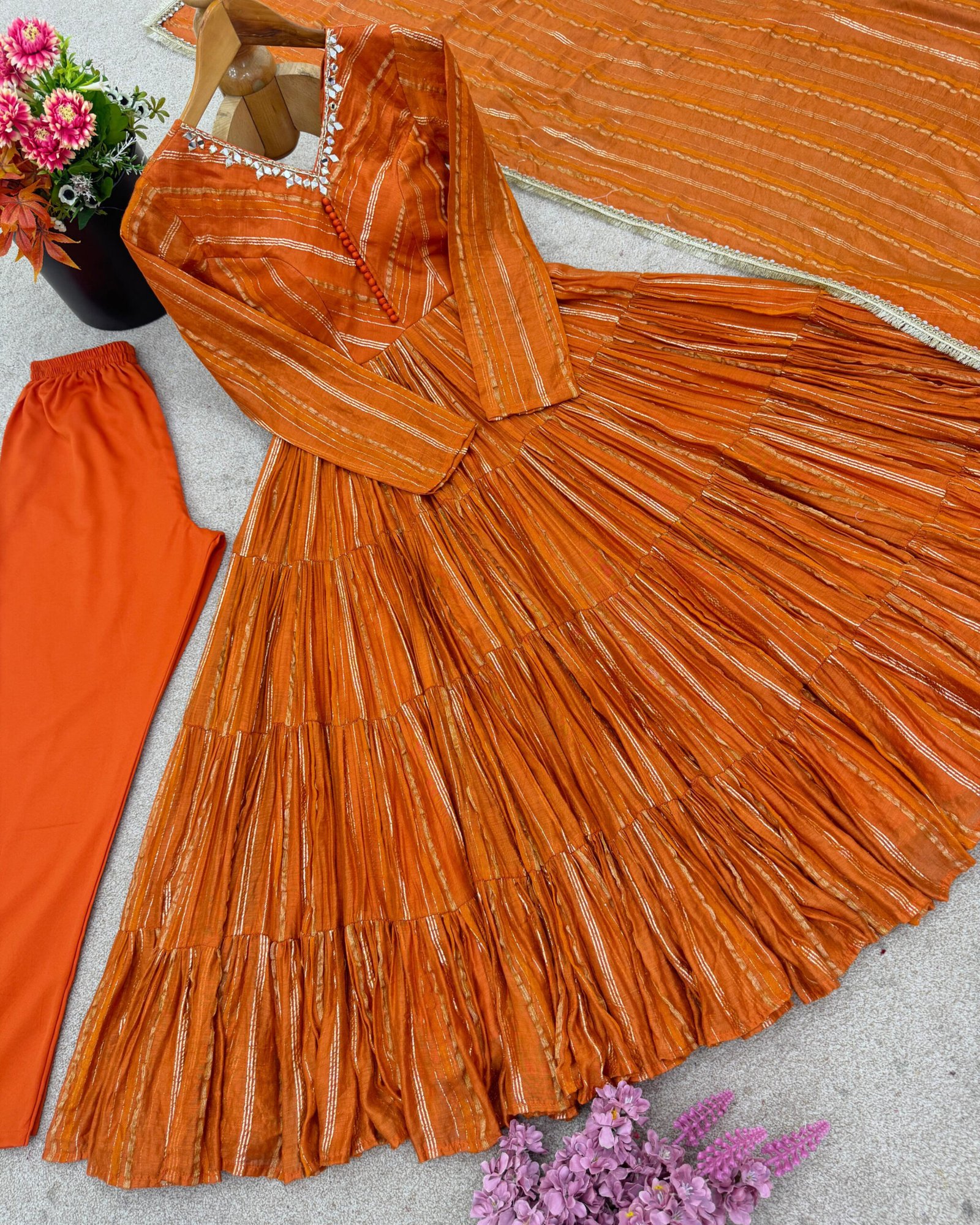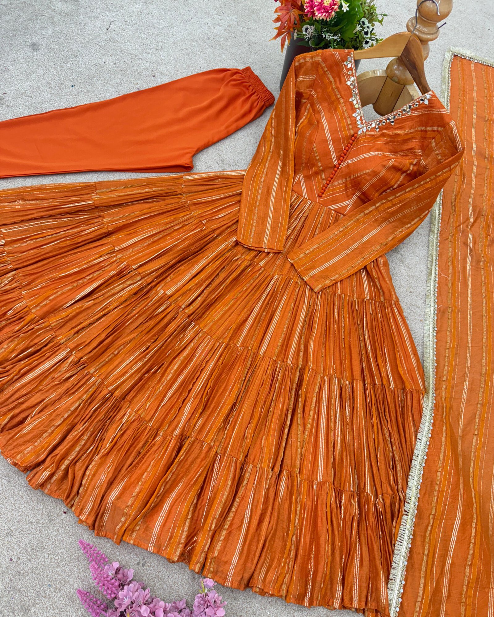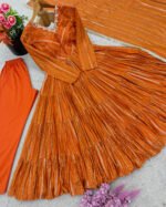 A stunning 3-piece ruffle gown set, crafted in rich Mal Chanderi with real mirror handwork. Fully stitched and ready to wear—perfect for festive elegance.
