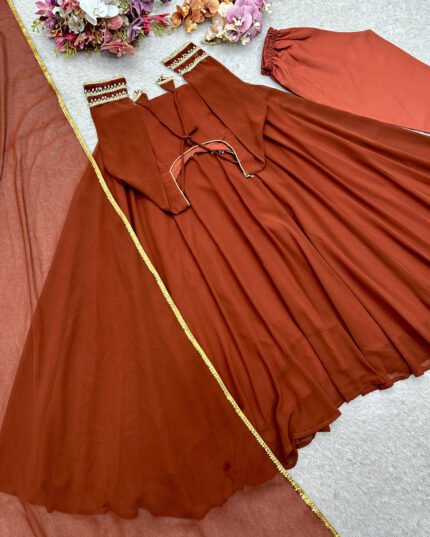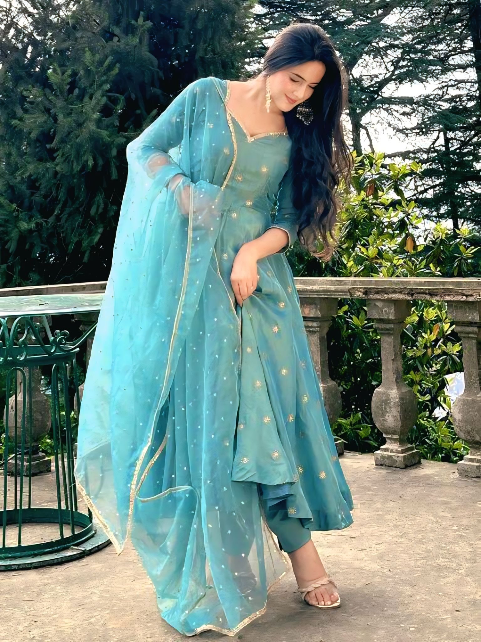 Step into elegance with our Sky Dream Ethnic Gown, a graceful blend of tradition and modern charm. Crafted in a soothing sky-blue shade, this flowy gown is adorned with delicate golden embroidery that adds just the right touch of shimmer. The sheer net dupatta with subtle embellishments completes the look, making it perfect for festive celebrations, weddings, or special occasions.