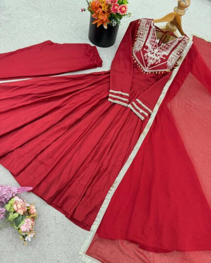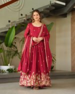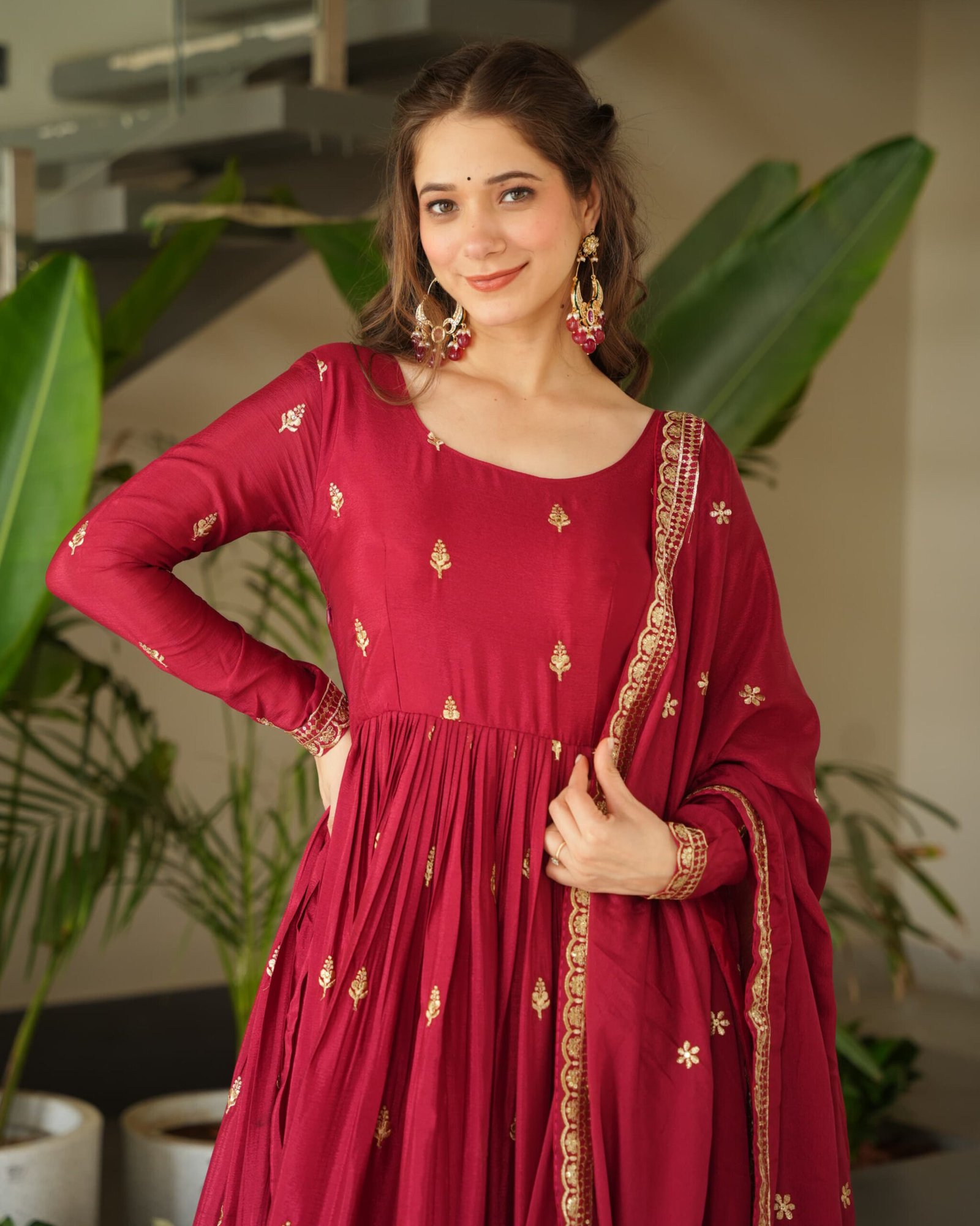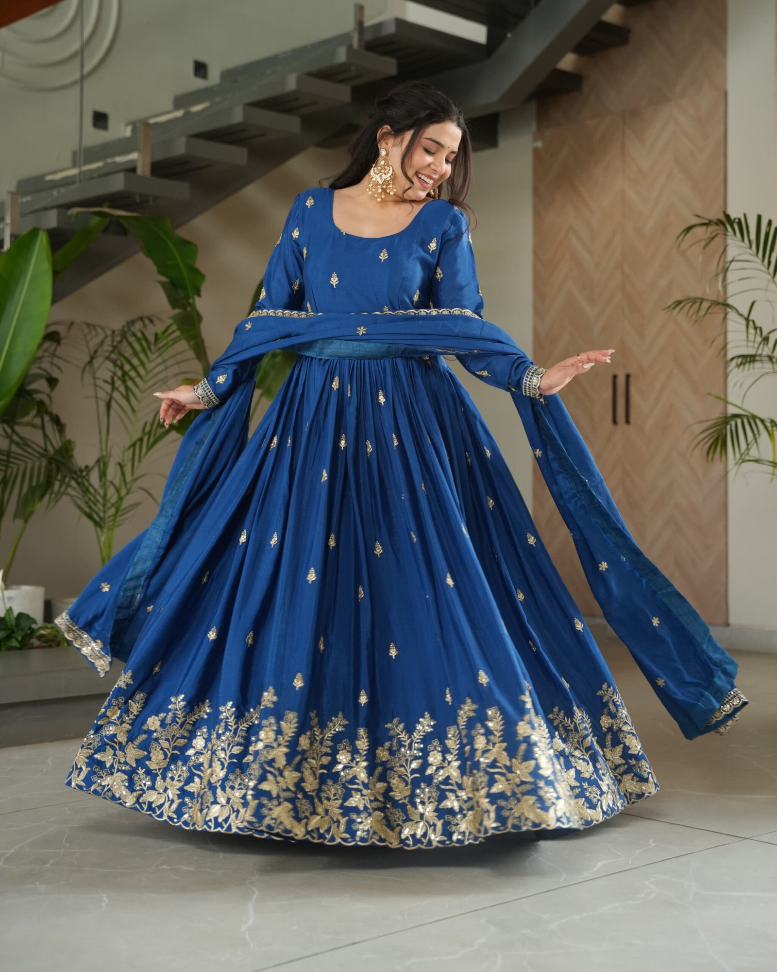 Elevate your festive and occasion wear collection with ZARA, a stunning premium readymade gown crafted from luxurious Chinnon fabric. Adorned with intricate embroidery, zari, and sequins work, this gown exudes timeless elegance and royal charm.